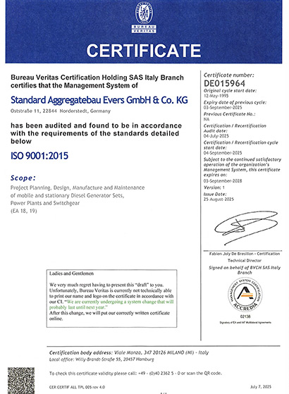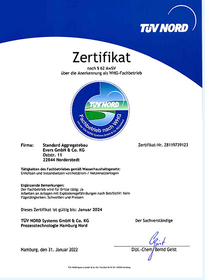We were one of the first diesel power generating set manufacturers in Germany to be certified in 1995 according to DIN EN ISO 9002:1994. Today both SAB factories are certified to DIN EN ISO 9001:2015 and also declared as a specialist company according to the water resource act.