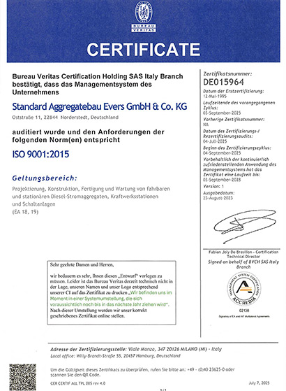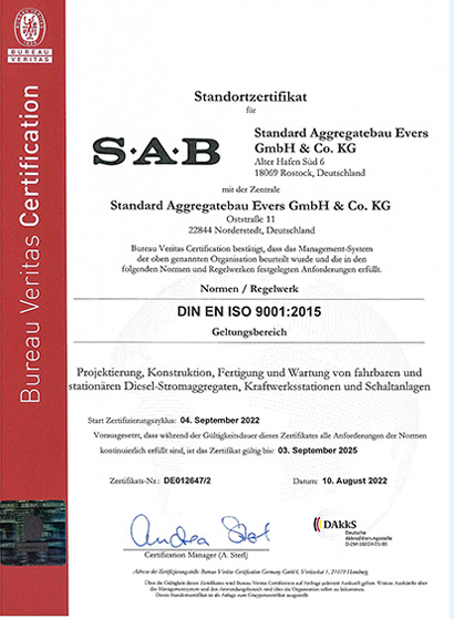 Als einer der ersten Dieselaggregate Hersteller in Deutschland wurde SAB 1995 nach DIN EN ISO Norm 9002:1994 zertifiziert.