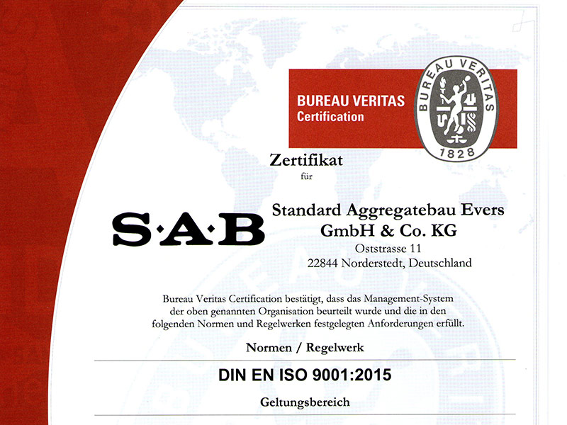 Im Januar 1961 gründete der Kaufmann Horst Evers in Hamburg die Evers & Co. Standard Aggregatebau KG - SAB. Heute produzieren wir Netzersatzanlagen auf über 40.000 qm in zwei voneinander unabhängigen Werken mit kompletter Einrichtung für die Fertigung. Dazu gehören Stahlbau, Schweißerei, Lackiererei, Prüffelder und die notwendigen Hebeeinrichtungen.