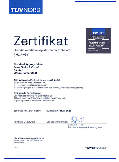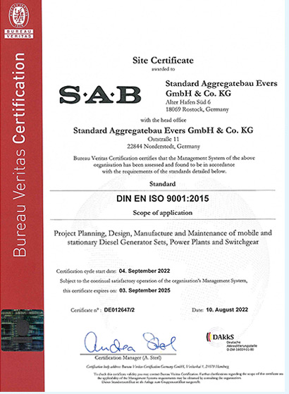 We were one of the first diesel power generating set manufacturers in Germany to be certified in 1995 according to DIN EN ISO 9002:1994. Today both SAB factories are certified to DIN EN ISO 9001:2015 and also declared as a specialist company according to the water resource act.